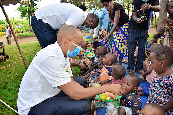KAYIHURA Azarias umukozi w'ibitaro bya Nyagatare ushinzwe imirire arimo agaburira abana indyo yuzuye