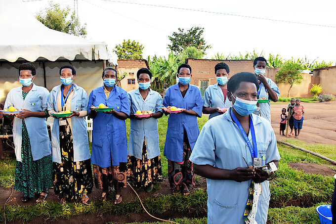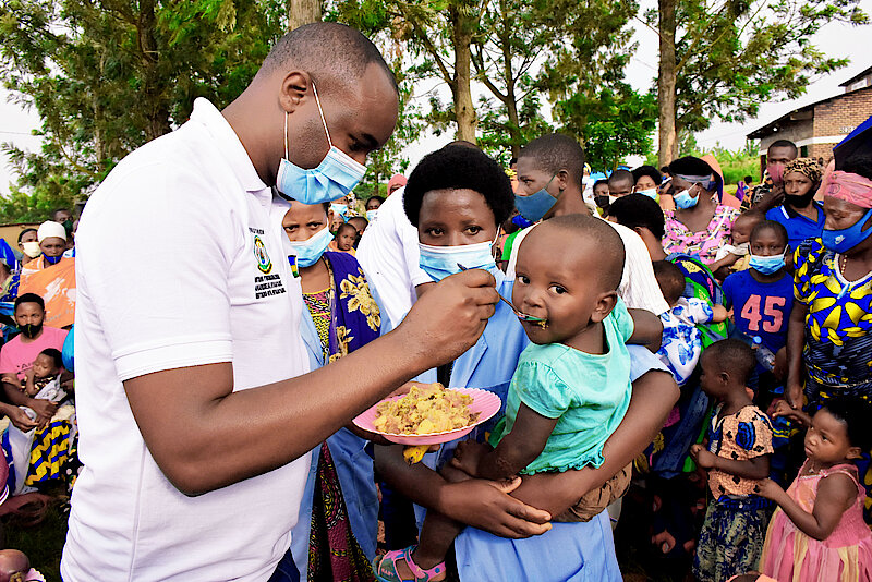 Babwiwe ko kandi umwana atungwa n’amashereka ya nyina gusa nta kindi avangiwe mu gihe cy’amazi atandatu. Nyuma y’amezi atandatu, akomeza konka ari na ko ahabwa imfashabere igizwe n’indyo yuzuye. Bagiriwe inama yo kwitabira igikoni cy’umudugudu, kugira umurima w’igikoni, kandi bagaha abana babo amafunguro arimo ibyubaka umubiri, ibitera imbaraga n’ibirinda indwara.
